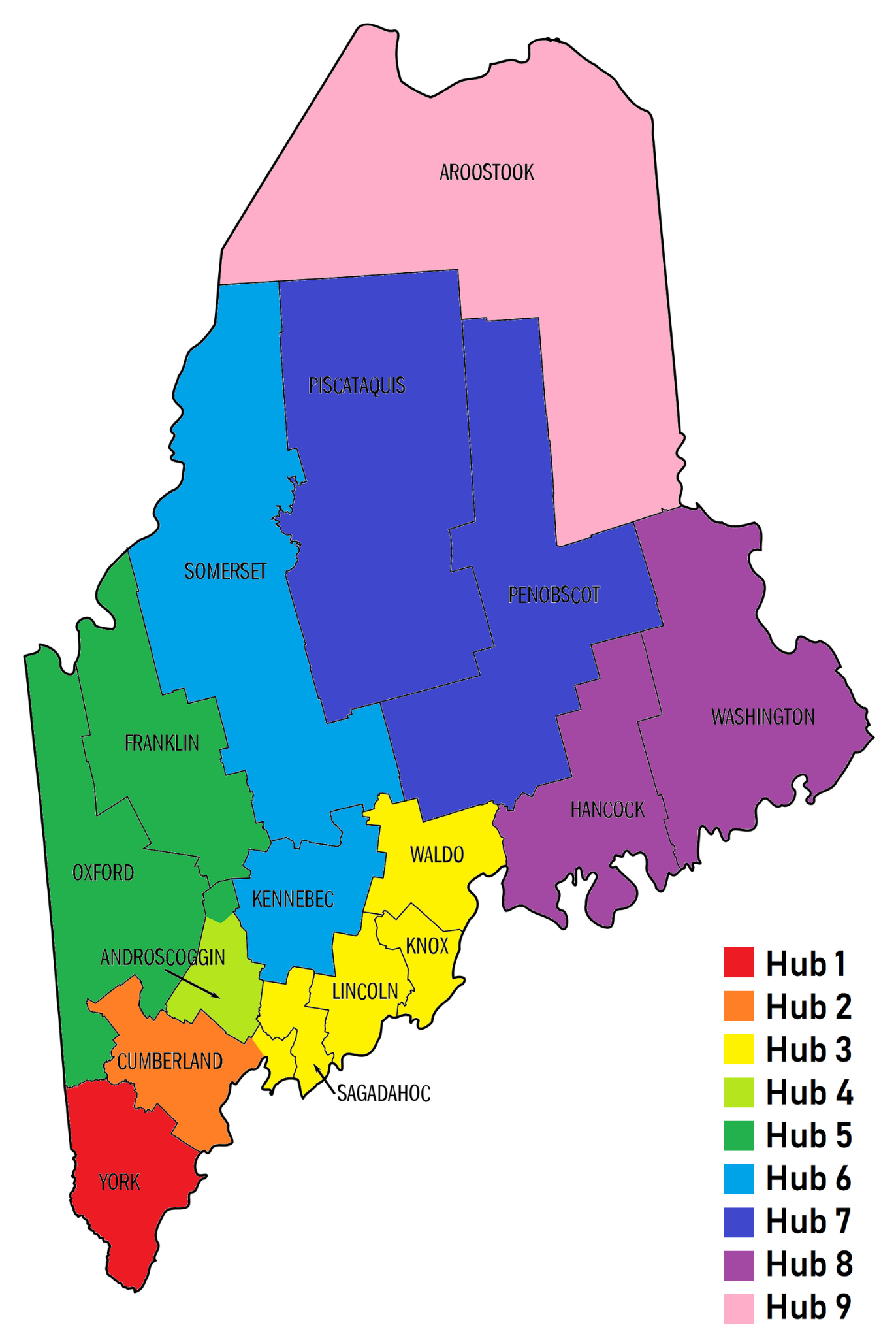• Hub 3: Midcoast (Sagadahoc, Knox, Lincoln, and Waldo Counties) *also the towns of Brunswick and Harpswell
